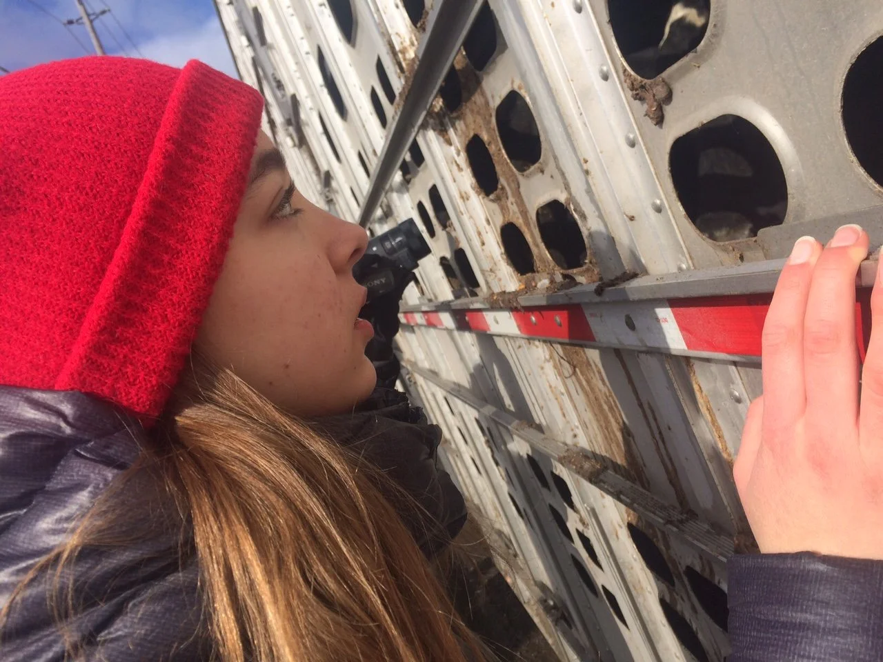 Melichar at a slaughterhouse vigil, organized by Toronto Cow Save (Stockyards, Toronto; March 13th, 2018; age 15).
